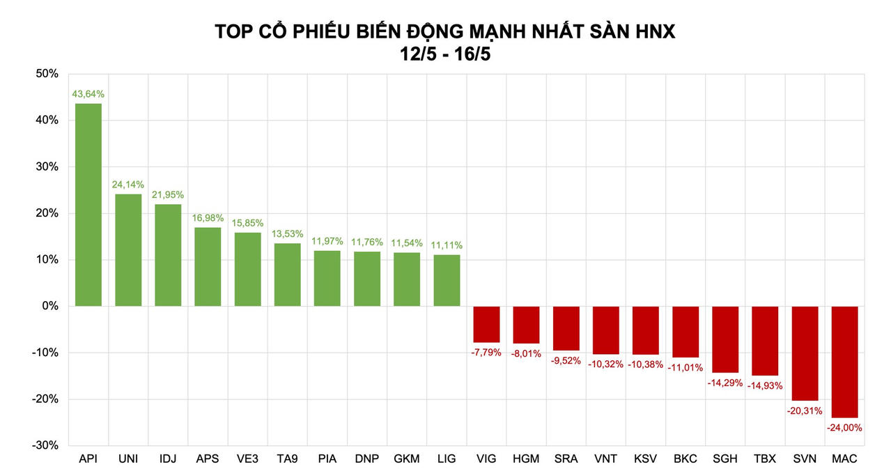 Trên sàn HNX, top 10 cổ phiếu tăng mạnh nhất tuần qua gồm: API (+43,64%), UNI (+24,14%), IDJ (+21,95%), APS (+16,98%), VE3 (+15,85%), TA9 (+13,53%), PIA (+11,97%), DNP (+11,76%), GKM (+11,43%) và LIG (+11,11%).