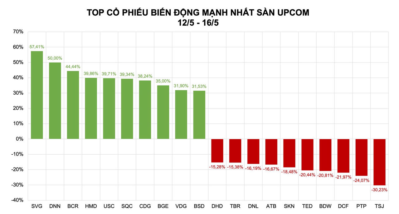 Trên sàn UpCOM, danh sách 10 cổ phiếu tăng mạnh nhất lần lượt ghi nhận sự góp mặt của: SVG (+57,41%), DNN (+50,00%), BCR (+44,44%), HMD (+39,86%), USC (+39,71%), SQC (+39,34%), CDG (+38,24%), BGE (+35,00%), VDG (+31,90%) và BSD (+31,53%).