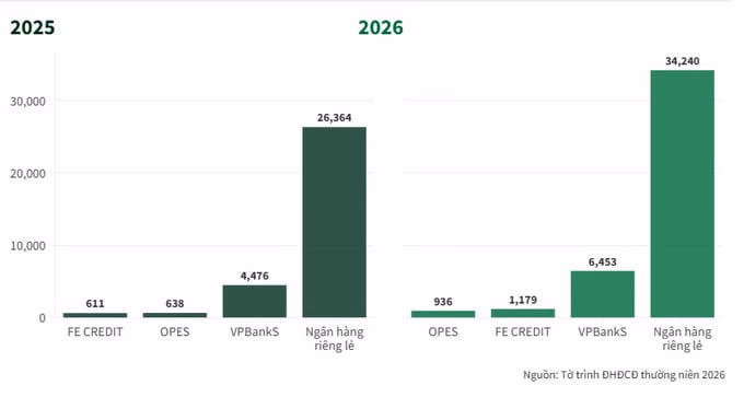 Theo kế hoạch dự kiến trình ĐHĐCĐ thường niên 2026, các trụ cột trong hệ sinh thái VPBank tiếp tục được kỳ vọng đóng vai trò dẫn dắt tăng trưởng. VPBankS dự kiến là đơn vị đóng góp lớn nhất với mục tiêu lợi nhuận năm nay đạt 6.453 tỷ đồng (tăng 44% so với thực hiện năm 2025), trong khi FE CREDIT đặt kế hoạch 1.179 tỷ đồng (tăng 93%), phản ánh kỳ vọng phục hồi mạnh mẽ sau tái cấu trúc. Ở mảng bảo hiểm, OPES cũng hướng tới 936 tỷ đồng lợi nhuận (tăng 47%), duy trì đà tăng trưởng cao.