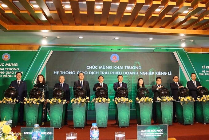 Phó Thủ tướng Chính phủ Lê Minh Khái (thứ 5, từ phải sang), Bộ trưởng Bộ Tài chính Hồ Đức Phớc (thứ 6, từ phải sang) và lãnh đạo các bộ, ngành đã chính thức khai trương vận hành hệ thống giao dịch trái phiếu doanh nghiệp riêng lẻ.