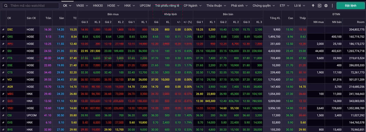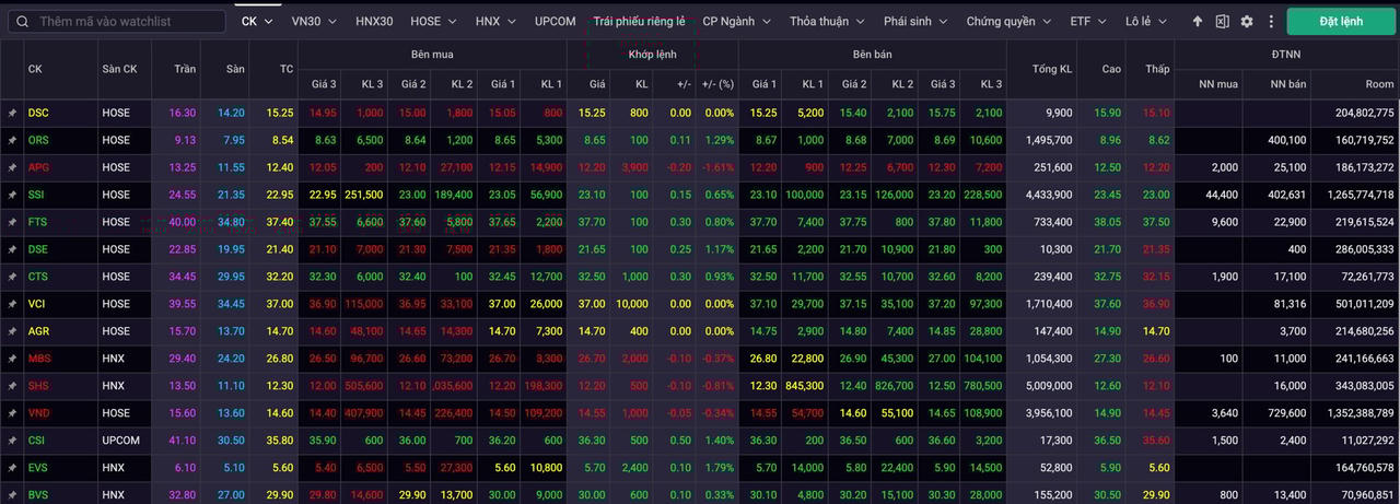 Kết thúc phiên sáng, ngoại trừ một vài mã như APG, SHS, MBS và VND điều chỉnh nhẹ, phần lớn cổ phiếu chứng khoán ghi nhận mức tăng từ 1–5%. Điều này cho thấy giới đầu tư đang đặt nhiều kỳ vọng vào cơ hội tăng trưởng của các công ty chứng khoán trong "kỷ nguyên" vận hành mới.