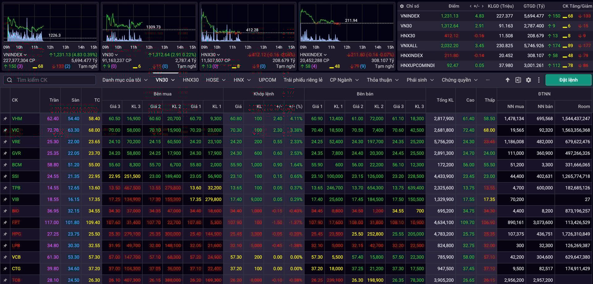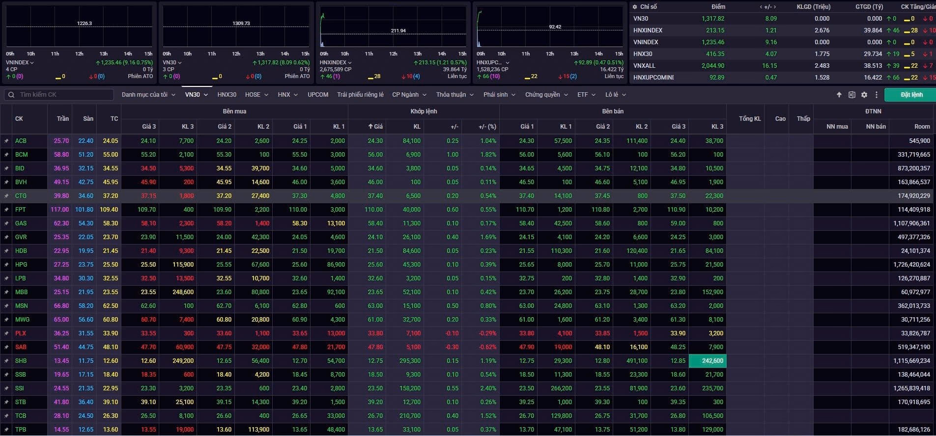 Trong rổ VN30, tâm điểm sự chú ý thuộc về bộ ba cổ phiếu “họ” Vin – VIC, VHM và VRE. Các mã này đồng loạt tăng mạnh, lần lượt ở mức 3,38%, 4,11% và 2,33%. Bên cạnh đó, GVR cũng gây chú ý với mức tăng 2,53%.