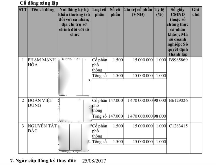 Cổ đông sáng lập gồm Phạm Mạnh Hoà (sinh năm 1986) góp 15 triệu đồng chiếm tỷ lệ 1%; Đoàn Việt Dũng góp 1,47 tỷ đồng (tỷ lệ 98%) và Nguyễn Tắt Đắc góp 15 triệu đồng (tỷ lệ 1%).