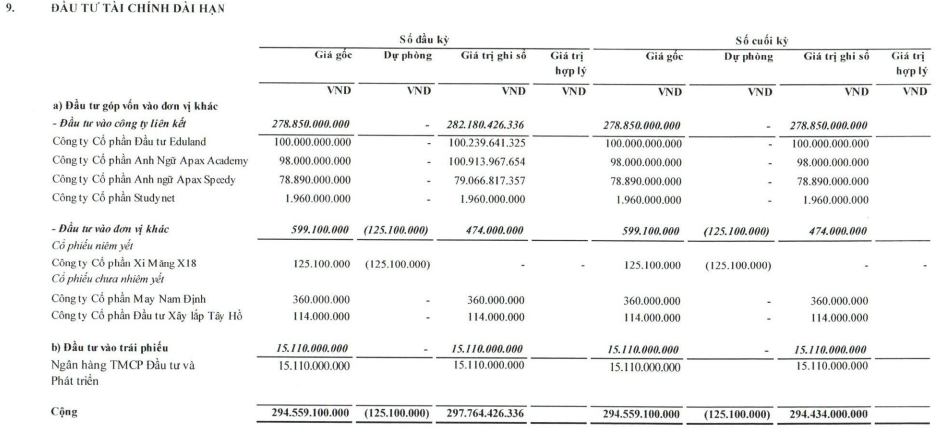 Hết quý, Công ty đang có gần 295 tỷ đồng đầu tư tài chính dài hạn, chủ yếu là đầu tư vào công ty liên kết với gần 279 tỷ đồng. Đáng chú ý, Apax Holdings có khoản đầu tư trái phiếu của Ngân hàng TMCP Đầu tư và Phát triển Việt Nam (BIDV) hơn 15 tỷ đồng.