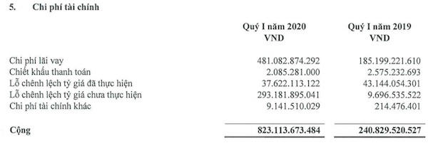 Việc đẩy mạnh nợ vay khiến chi phí lãi vay của Tập đoàn tăng gấp 2,6 lần cùng kỳ năm 2019 đạt 481 tỷ bên cạnh khoản lỗ chênh lệch tỷ giá chưa thực hiện hơn 290 tỷ đồng.