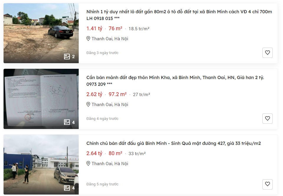 Đơn cử như tại huyện Thanh Oai, khu vực xã Bình Minh được rao bán từ mức 40-45 triệu đồng/m2, giảm nhẹ khi giá chào bán đang ở mức 40-42 triệu đồng/m2. Thậm chí có những nơi chỉ từ 18-33 triệu/m2.