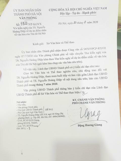 Dự án của TS. Nguyễn Hoàng Điệp đã được Thủ tướng Chính phủ xem xét. Văn phòng Thủ tướng Chính phủ đã gửi Công văn số 5473/VPCP – KGVX ngày 7 – 7 – 2020 cho TP. Hà Nội.