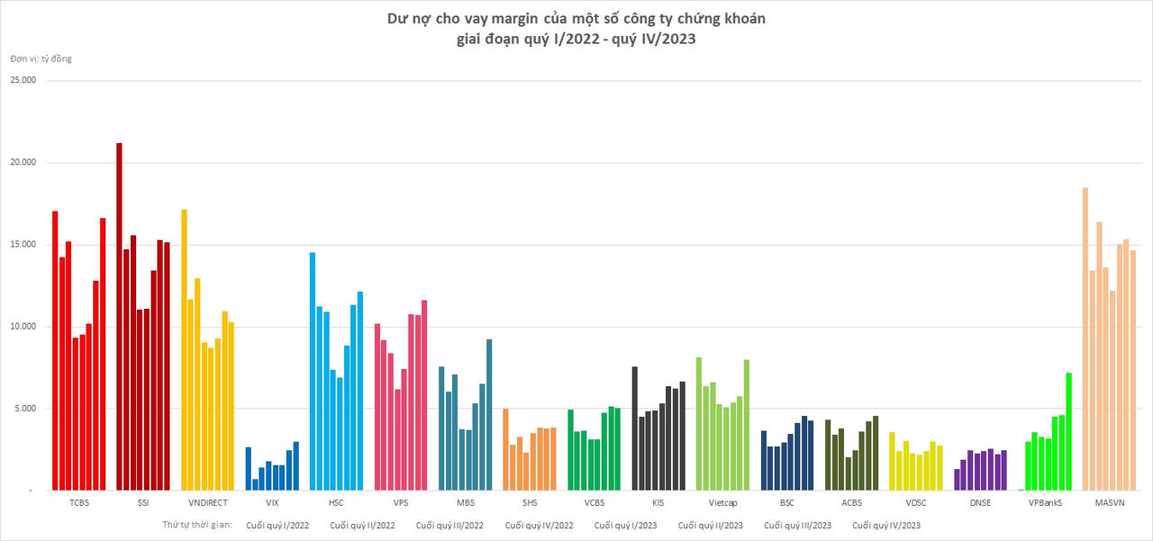 Trong khi đó, các công ty chứng khoán độc lập có dư nợ margin lớn lại có xu hướng chững lại trong quý vừa qua. Chẳng hạn như "quán quân" dư nợ margin tính đến cuối quý III/2023 là MASVN suy giảm 651 tỷ đồng dư nợ margin trong quý IV/2023. Bên cạnh đó, dư nợ margin của SSI cũng giảm 135 tỷ đồng, VNDIRECT giảm 674 tỷ đồng trong cùng thời gian.