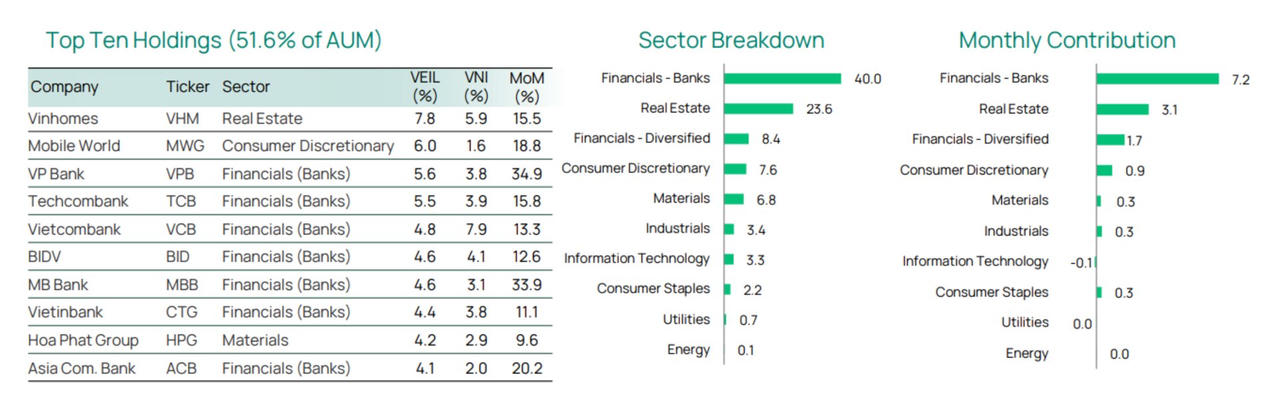 Tính đến cuối tháng 8, danh mục của VEIL tập trung vào 10 cổ phiếu lớn, chiếm 51,6% tổng tài sản, gồm: VHM, MWG, VPB, TCB, VCB, BID, MBB, CTG, HPG và ACB. Xét theo cơ cấu ngành, ngân hàng dẫn đầu với tỷ trọng 40%, tiếp đến là bất động sản 23,6%, tài chính đa ngành 8,4%, tiêu dùng không thiết yếu 7,6% và vật liệu 6,8%.
