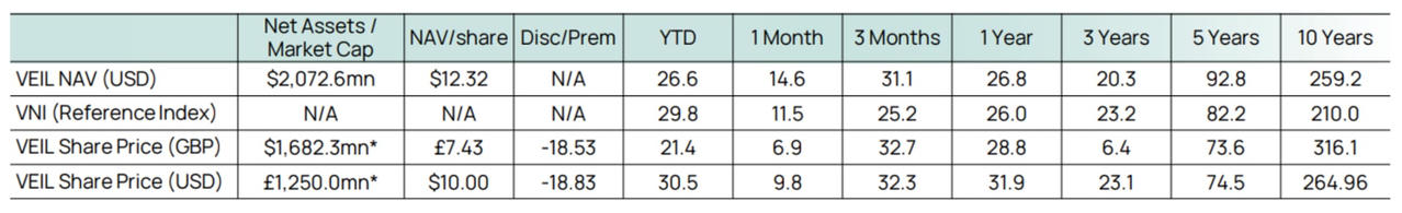 Tháng 8 đánh dấu bước tiến ấn tượng của VEIL khi giá trị tài sản ròng (NAV) đạt 2,07 tỷ USD, tăng 14,6% so với tháng trước, vượt trội so với mức tăng 11,5% của VN-Index. Đây là tháng thứ hai liên tiếp quỹ ngoại này duy trì hiệu suất vượt chỉ số, nối dài đà phục hồi mạnh mẽ từ tháng 7. Tuy nhiên, tính từ đầu năm đến hết tháng 8, VEIL mới ghi nhận mức tăng 26,6% tính theo USD, vẫn thấp hơn mức 29,8% của VN-Index.