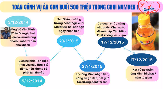 Câu chuyện bắt đầu từ ngày 3/12/2014, khi bán hàng cho khách, chủ quán cơm Võ Văn Minh (Nhà Bè, Tiền Giang) phát hiện có con ruồi trong chai nước Number 1 chưa mở nắp của Tân Hiệp Phát. Anh Minh giữ lại chai nước, liên hệ Tân Hiệp Phát yêu cầu gặp đại diện thương lượng. Việc thương lượng giữa 2 bên kéo dài đến lần thứ 3 thì “chốt số” với con số 500 triệu đồng. Hai bên hẹn gặp ngày 27/1/2015 để giao tiền tại 1 quán cafe. Cao trào là, lúc anh Minh nhận 500 triệu đồng, Cảnh sát hình sự Công an tỉnh Tiền Giang xuất hiện và bắt qủa tang. Anh Minh bị truy tố, xét xử tội “cưỡng đoạt tài sản”, anh Minh bị xử tù giam 7 năm.