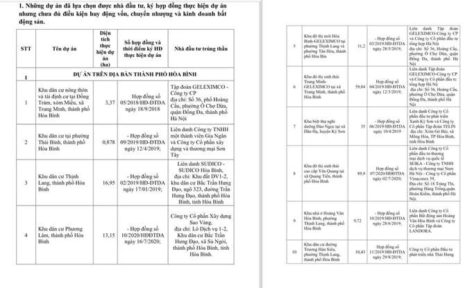 Theo đó, tại thành phố Hòa Bình có các dự án Khu dân cư tại phường Thái Bình, thành phố Hòa Bình. Nhà đầu tư trúng thầu là Liên danh Công ty TNHH MTV Gia Ngân và Công ty Cổ phần xây dựng và thương mại Sơn Tây.
