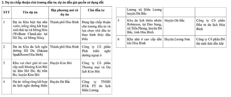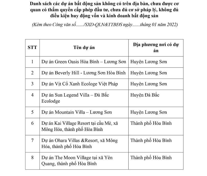 8 dự án bất động sản không có trên địa bàn, chưa được cơ quan có thẩm quyền cấp phép đầu tư, chưa đủ cơ sở pháp lý, không đủ điều kiện huy động vốn và kinh doanh bất động sản được Sở Xây dựng công khai gồm: Dự án Green Oasis Hòa Bình – Lương Sơn; Dự án Beverly Hill – Lương Sơn Hòa Bình; Dự án Vịt Cổ Xanh Ecologe Việt Pháp; Dự án Sun Legend Villa – Đà Bắc Ecolodge; Dự án Mountain Villa – Lương Sơn; Dự án Kai Village Resort tại cầu Mè, xã Mông Hóa, thành phố Hòa Bình; Dự án Ohara Villas &Resort, xã Mông Hóa, thành phố Hòa Bình; Dự án The Moon Village tại xã Yên Quang, thành phố Hòa Bình.