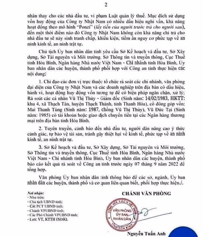 Mới đây, Văn phòng UBND tỉnh Hòa Bình đã ra văn bản số 7327/VPUBND-KTTH cảnh báo về hoạt động của Công ty CP Đầu tư thương mại Bất động sản Nhật Nam.