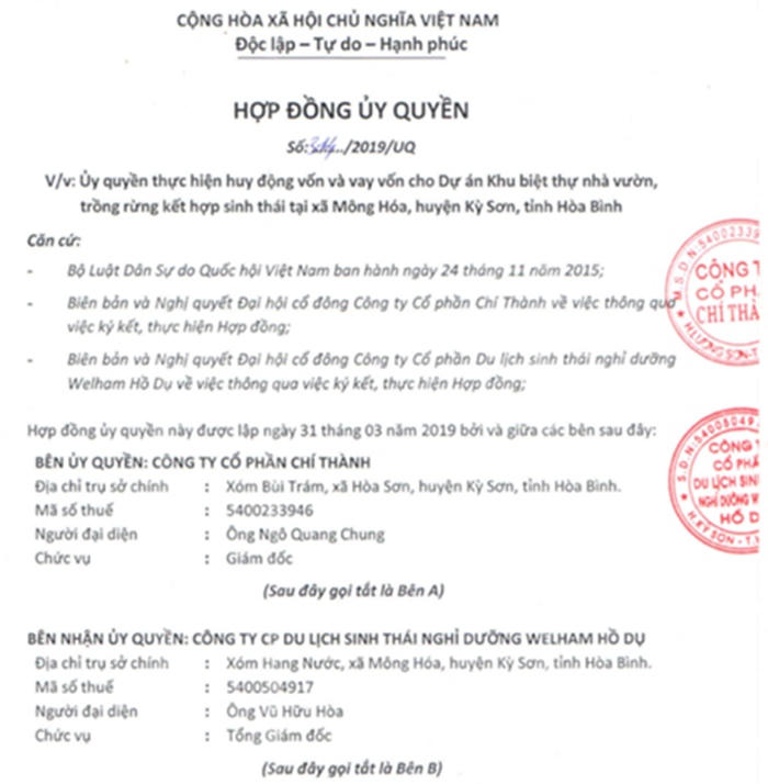 Phải chăng đây chính là cơ sở để dư luận có quyền đánh giá năng lực của Công ty cổ phần Chí Thành. Tại sao công ty này phải ủy quyền cho Công ty cổ phần du lịch sinh thái nghỉ dưỡng Welham Hồ Dụ huy động vốn vay vốn cho dự án trong khi dự án còn chưa được hình thành?