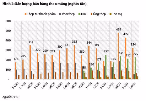 VDSC cho biết sản lượng thép xây dựng bán ra trong tháng 5 đầu năm của Hòa Phát giảm xuống còn khoảng hơn 320.000 tấn sau khi tăng mạnh trong tháng 3 và tháng 4. Trong đó, tỷ trọng sản lượng xuất khẩu tăng từ mức 17% trong 4 tháng 2021 lên 21,6% trong tháng 5.