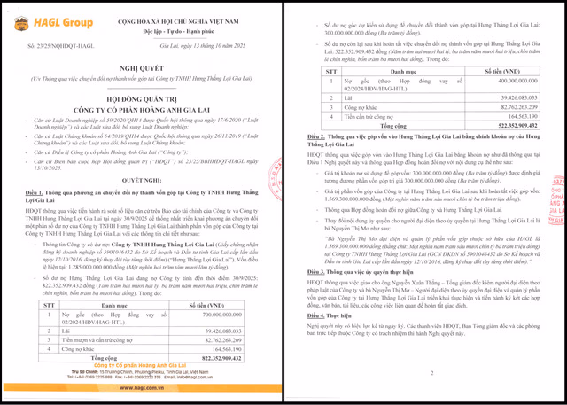 CTCP Hoàng Anh Gia Lai (HAGL, mã chứng khoán: HAG) vừa côngbố nghị quyết HĐQT ngày 13/10/2025 thông qua việc chuyển đổi nợ thành vốn góp tạiCông ty TNHH Hưng Thắng Lợi Gia Lai. Đây là công ty con của HAGL và là tổ chứccó liên quan của bà Võ Thị Mỹ Hạnh - thành viên HĐQT kiêm Phó tổng giám đốcHAGL.