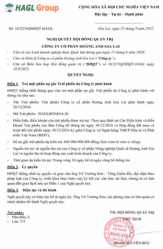 Hoàng Anh Gia Lai (HoSE: HAG) công bố Nghị quyết HĐQT thông qua việc trả một phần nợ gốc trái phiếu phát hành ngày 30/12/2016, mã trái phiếu HAGLBOND16/26. Giá trị trả nợ 605 tỷ đồng, nguồn trả nợ từ nguồn thu nợ của Công ty cổ phần nông nghiệp quốc tế Hoàng Anh Gia Lai (HAGL Agrico, HoSE: HNG) và từ hoạt động kinh doanh. Thời gian trả nợ dự kiến trong vòng 10 ngày kể từ ngày công bố thông tin.