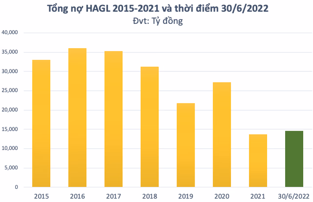 Tổng nợ của HAGL đã giảm mạnh, từ cao điểm hơn 35.000 tỷ đồng (năm 2016) xuống mức 14.000 tỷ đồng (tính đến giữa năm 2022). Nợ ngân hàng tương ứng giảm từ mức 28.000 tỷ xuống còn 8.000 tỷ đồng hiện nay.
