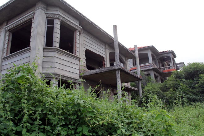 Dãy biệt thự cao cấp xây nửa chừng phải dừng lại nằm cheo leo bên một quả đồi ven biển không có bảo vệ. Để tiếp cận được những căn nhà này phải băng qua nhiều lớp cỏ dại phủ kín lối đi.