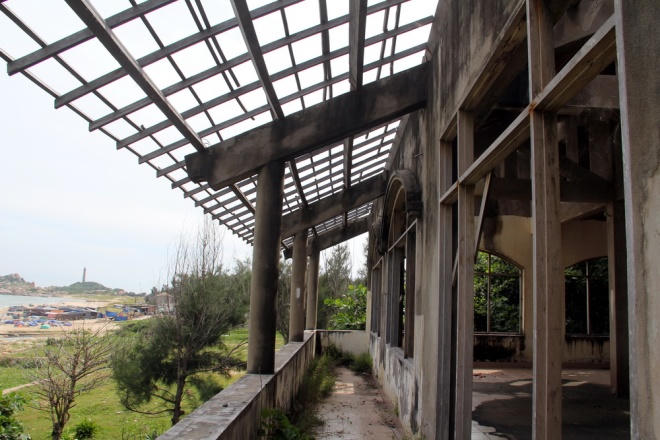 Một tòa nhà mặt tiền được làm bằng gỗ nhìn ra biển và ngọn hải đăng Kê Gà trong Khu du lịch Đồi Phong Lan chỉ còn trơ khung.