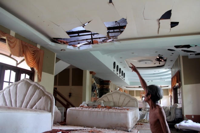 Giường nệm cùng trần nhà tan hoang, mưa gió khiến nhiều đồ đạc hư hỏng càng nặng nề hơn. Theo UBND tỉnh Bình Thuận, trong 12 dự án bị ảnh hưởng thì Khu du lịch Thế giới xanh bị thiệt hại nặng nề nhất.
