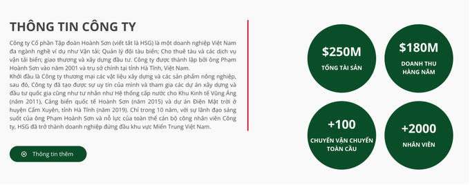 Tập đoàn Hoành Sơn được biết đến là một trong những doanh nghiệp “đình đám” tại Hà Tĩnh, có trụ sở chính tại phường Đức Thuận, thị xã Hồng Lĩnh. Doanh nghiệp này được thành lập ngày 19/1/2001 bởi doanh nhân ông Phạm Hoành Sơn (hay còn được biết tới với biệt danh Sơn “xay xát”). Ông Sơn hiện đang là Chủ tịch HĐQT kiêm người đại diện pháp luật của Tập đoàn, đồng thời cũng là cổ đông lớn nhất của doanh nghiệp này. Sau hơn 20 năm phát triển, vốn điều lệ của Hoành Sơn đang ghi nhận ở mức 2.000 tỷ đồng. Còn theo giới thiệu trên website, Hoành Sơn có quy mô 2.000 nhân viên với tổng tài sản ở mức 250 triệu USD và doanh thu hàng năm lên tới 180 triệu.