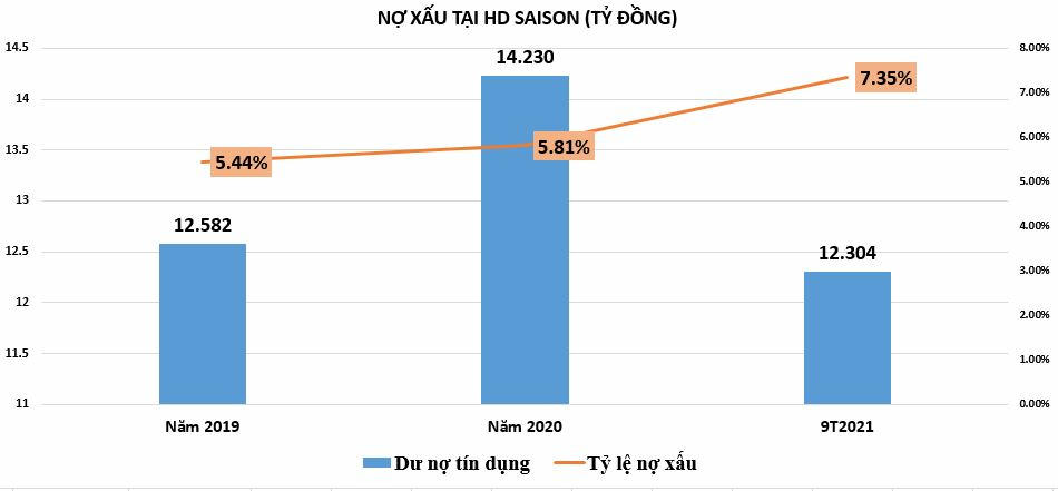 Về dư nợ tín dụng, tính đến cuối tháng 9/2021, tín dụng của HD Saison sụt giảm mạnh 13,5% so với đầu năm, xuống còn 12.304 tỷ đồng. Đáng nói, tín dụng giảm song tỷ lệ nợ xấu vẫn tăng vọt lên 7,35%, ghi nhận khoảng hơn 904 tỷ đồng. Trước đó, tỷ lệ nợ xấu tại HD Saison tăng từ mức 5,44% tại thời điểm cuối năm 2019 lên mức 5,81% vào cuối năm 2020.