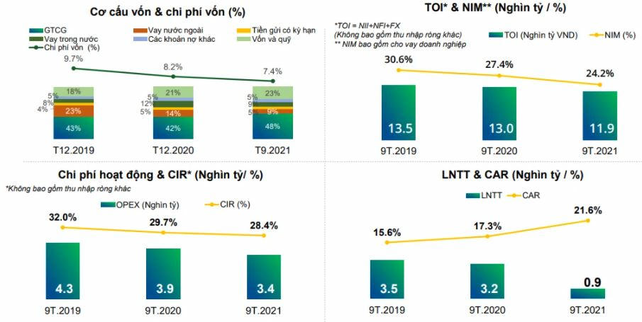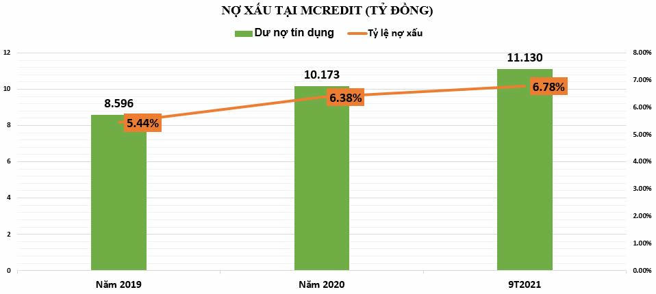 Dựa vào báo cáo tài chính riêng lẻ, nợ xấu tại ngân hàng mẹ cuối tháng 9/2021 là 2.400 tỷ đồng, giảm hơn 6% so với đầu năm; nợ xấu hợp nhất là 3.186 tỷ đồng. Như vậy, ước tính nợ xấu tại công ty con Mcredit khoảng 755 tỷ đồng.