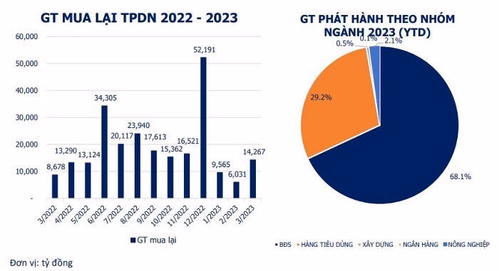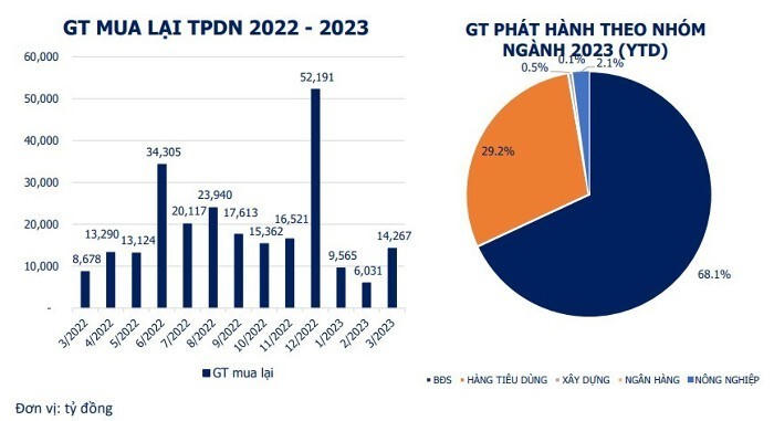 Riêng trong tháng 3, tổng giá trị trái phiếu đã được các doanh nghiệp mua lại trước hạn là gần 14.300 tỷ đồng, tăng 137% so với tháng trước và tăng 64% so với cùng kỳ tháng 3/2022. Trong đó, xây dựng và hàng tiêu dùng là hai nhóm ngành ghi nhận giá trị mua lại lớn nhất trong tháng, lần lượt đạt 5.000 tỷ đồng và 3.400 tỷ đồng, tương đương chiếm 35% và 24% trong tổng giá trị mua lại.