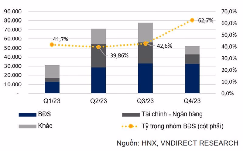 Trong đó, nhóm các doanh nghiệp bất động sản (BĐS) là nhóm ngành có tỷ trọng phát hành TPDN lớn nhất trong quý 1/2023 khi chiếm hơn 85% tổng GTPH, tiếp theo là nhóm tập đoàn đa ngành và nhóm ngân hàng với tỷ lệ phát hành chiếm lần lượt là 12,35% và1,41% tổng GTPH.