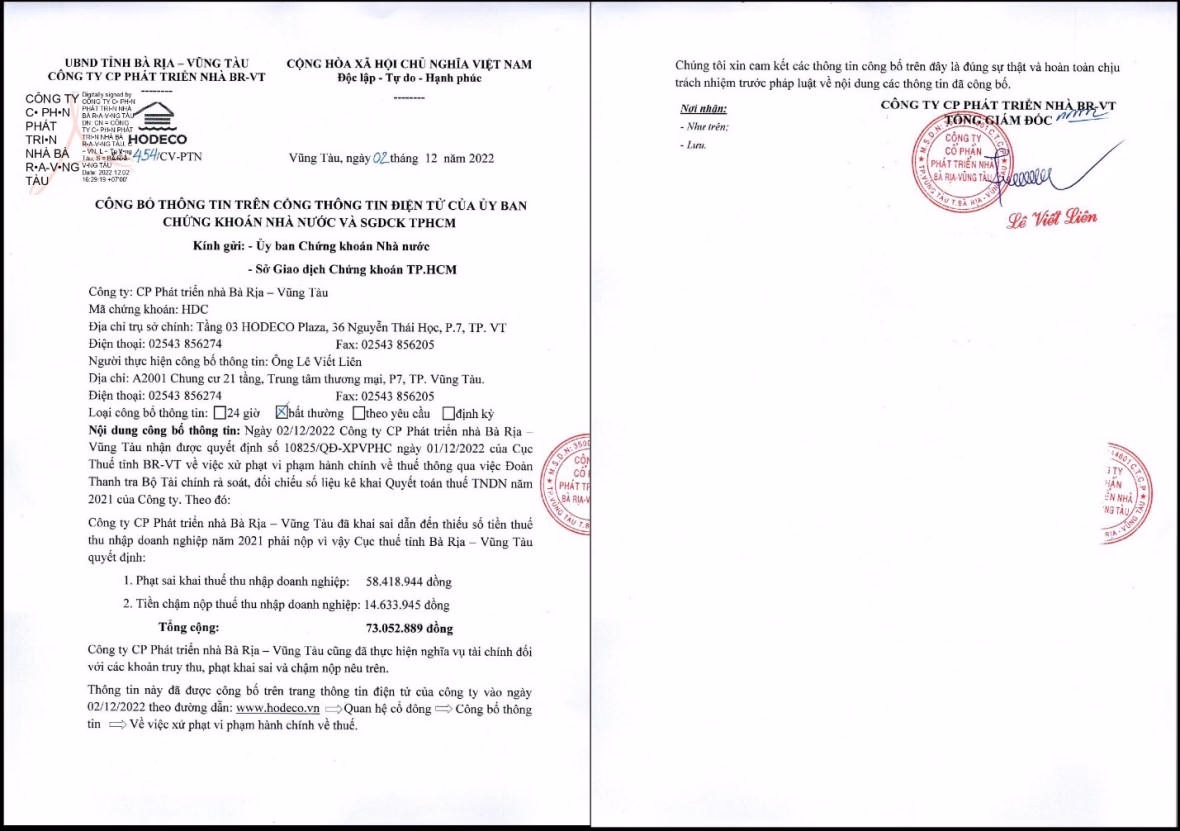 Cụ thể, ngày 2/12/2022, Hodeco đã nhận Quyết định số 10825/QĐ-XPVPHC ngày 1/12/2022 của Cục Thuế tỉnh Bà Rịa – Vũng Tàu về việc xử phạt vi phạm hành chính về thuế thông qua việc Đoàn Thanh tra Bộ Tài chính rà soát, đối chiếu số liệu kê khai Quyết toán thuế Thu nhập doanh nghiệp năm 2021.