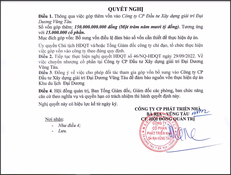 Công ty cổ phần Phát triển nhà Bà Rịa - Vũng Tàu (Hodeco, mã CK: HDC) vừa thông qua việc góp thêm 150 tỷ đồng vào CTCP Đầu tư Xây dựng giải trí Đại Dương Vũng Tàu (chủ đầu tư dự án Khu du lịch Đại Dương). Bên cạnh đó, HDC cũng đính chính thông tin về tài sản đảm bảo của lô trái phiếu trị giá 30 tỷ đồng đã được phát hành trước đó.