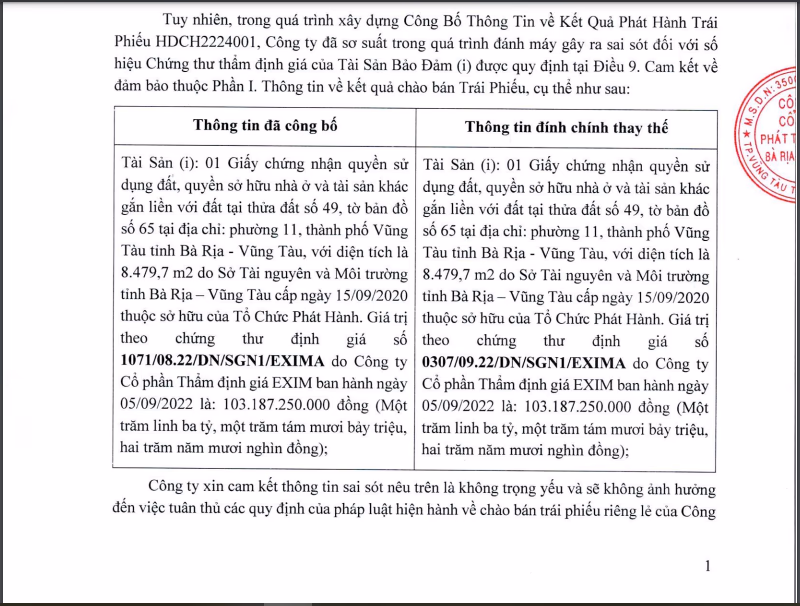 Tuy nhiên, mới đây, Hodeco đã thông báo về việc đính chính danh mục Tài sản đảm bảo trong lô trái phiếu trên. Cụ thể, thông tin được đính chính: 01 giấy chứng nhận quyền sử dụng, quyền sở hữu nhà ở và tài sản khác gắn liền với đất tại thửa số 49, tờ bản đồ số 65 tại phường 11, thành phố Vũng Tàu, tỉnh Bà Rịa - Vũng Tàu với quy mô 8.479,7 m2 do Sở Tài nguyên và Môi trường tỉnh Bà Rịa – Vũng Tàu cấp ngày 15/09/2020 thuộc sở hữu của Tổ chức Phát hành. Giá trị theo chứng thư định giá số 0307/09.22/DN/SGN1/EXIMA do Công ty cổ phần Thẩm định EXIM ban hành ngày 05/09/2022 là 103,19 tỷ đồng.