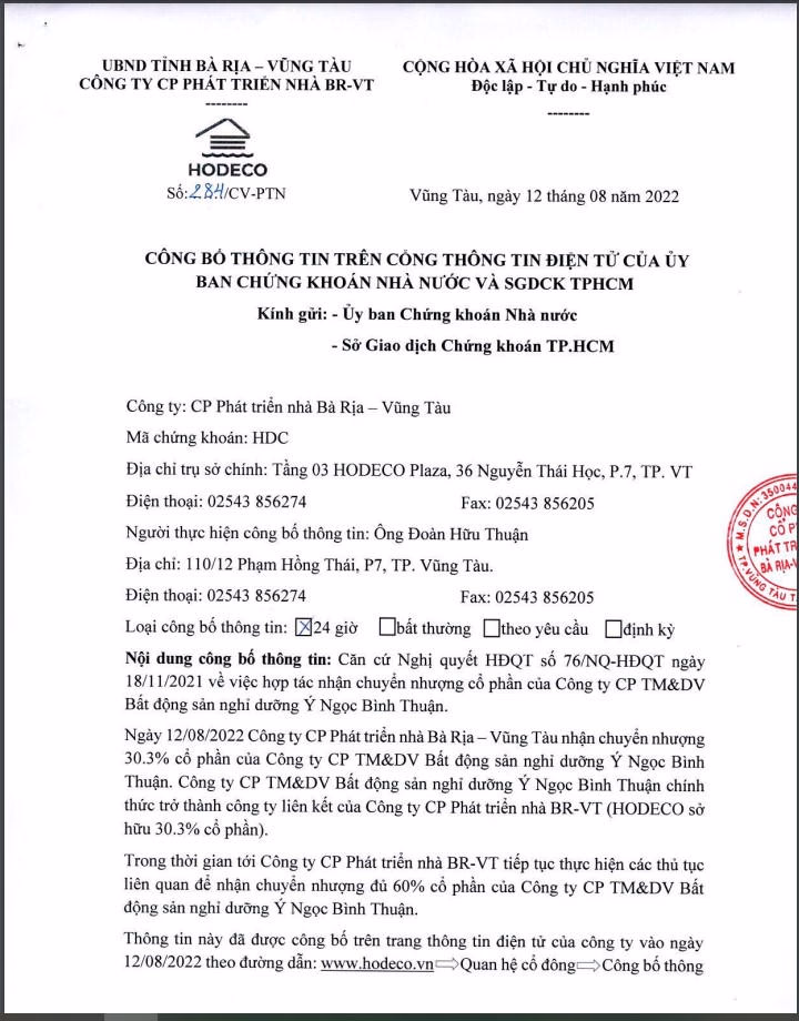 CTCP Phát triển nhà Bà Rịa – Vũng Tàu (Hodeco, Mã CK: HDC) cho biết sẽ tiếp tục nhận đủ 60% cổ phần của CTCP TM&DV Bất động sản nghỉ dưỡng Ý Ngọc Bình Thuận (chủ dự án Khu nghỉ dưỡng Biển Đá Vàng Resort).