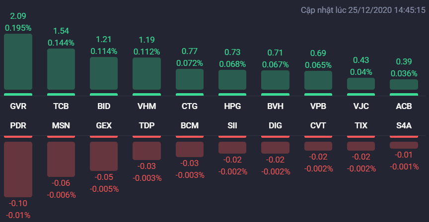 Bên cạnh đó, hàng loạt cổ phiếu vốn hóa lớn như GVR, BVH, TCB, VCS, TPB, HDB, VPB hay HVN... cũng đua nhau tăng giá mạnh và góp công lớn trong việc đẩy VN-Index và HNX-Index bứt phá mạnh vào cuối phiên. GVR được kéo lên mức giá trần, BVH tăng đến 6%, TCB tăng 5,7%, VCS tăng 5,1%.