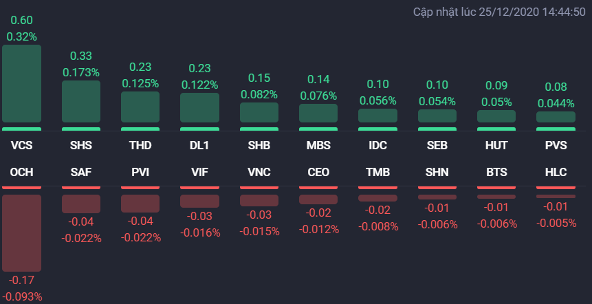 SCR tăng 5,2% lên 8.420 đồng/cp. Mới đây, VCI thông báo đã bán hơn 19 triệu cổ phiếu, tương đương 5,19% vốn của SCR từ 18/12 đến 23/12. Sau giao dịch, VCI không còn là cổ đông của SCR.