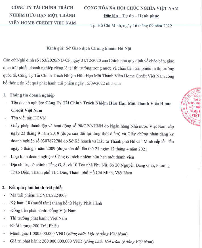 Trước đó, vào ngày 31/8, đơn vị này đã hoàn tất phát hành lô trái phiếu trị giá 600 tỷ đồng thành công. Theo đó, lô có kỳ hạn 24 tháng và đáo hạn vào ngày 31/8/2024. Các thông tin về lãi suất, trái chủ, hay bên đứng ra sắp xếp thương vụ cũng không được công bố. Như vậy, trong chưa chưa đầy 1 tháng, Home Credit đã phát hành tổng cộng 900 tỷ đồng trái phiếu.