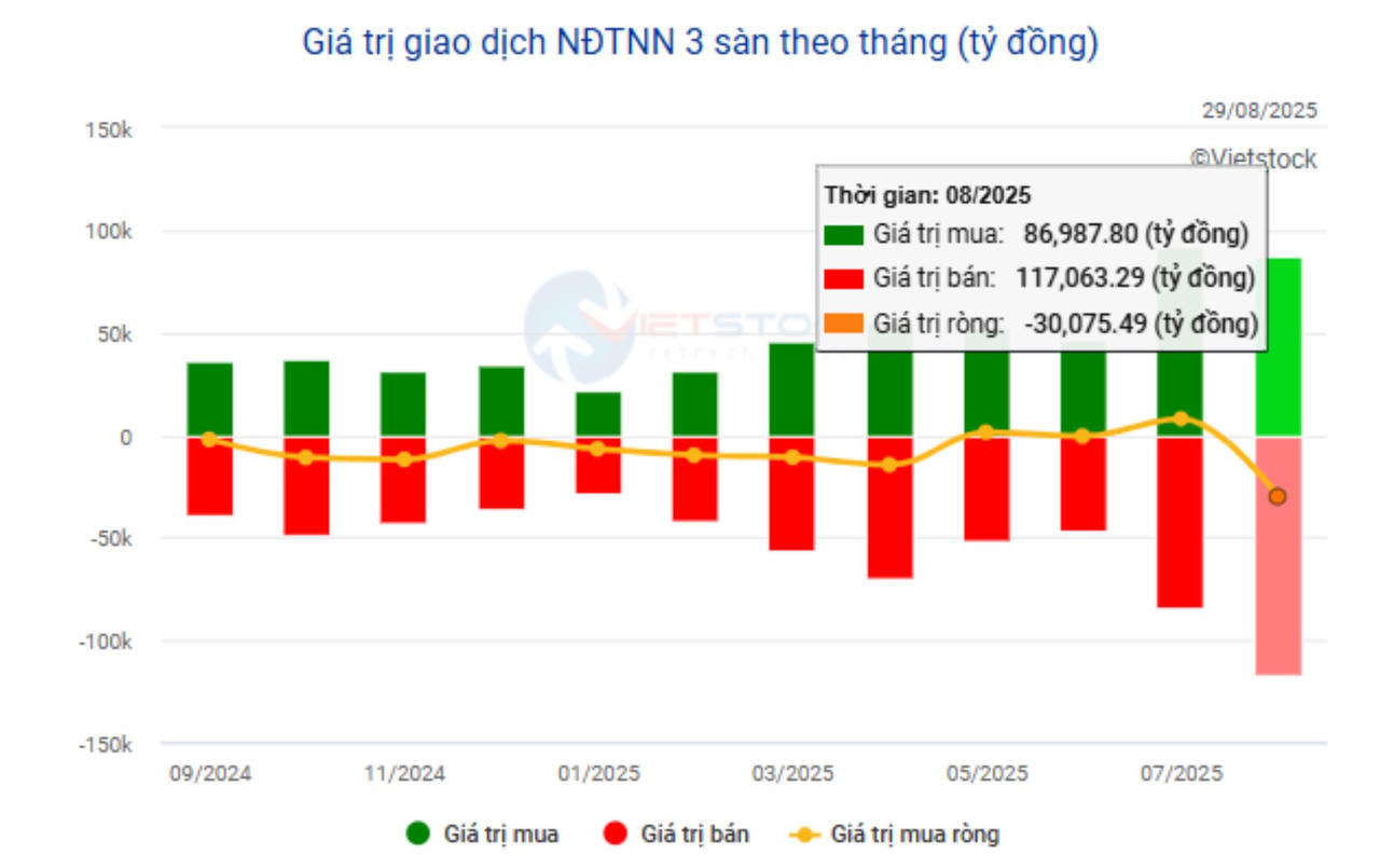 Chỉ trong tháng 8, khối ngoại đã bán ròng hơn 30.000 tỷ đồng (tương đương hơn 1,1 tỷ USD) trên thị trường chứng khoán Việt Nam – mức cao nhất từ trước tới nay.