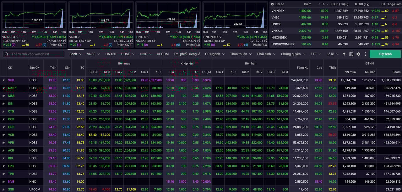Các mã ngân hàng khác trong rổ VN30 như VPB, MBB, CTG, TCB... cũng duy trì đà tăng tích cực, với thanh khoản vượt trung bình 20 phiên gần nhất. Đáng chú ý, đà lan tỏa không chỉ dừng lại ở nhóm vốn hóa lớn mà còn mở rộng tới các ngân hàng ngoài VN30, cho thấy dòng tiền đang đồng thuận đổ vào toàn bộ nhóm ngành tài chính.