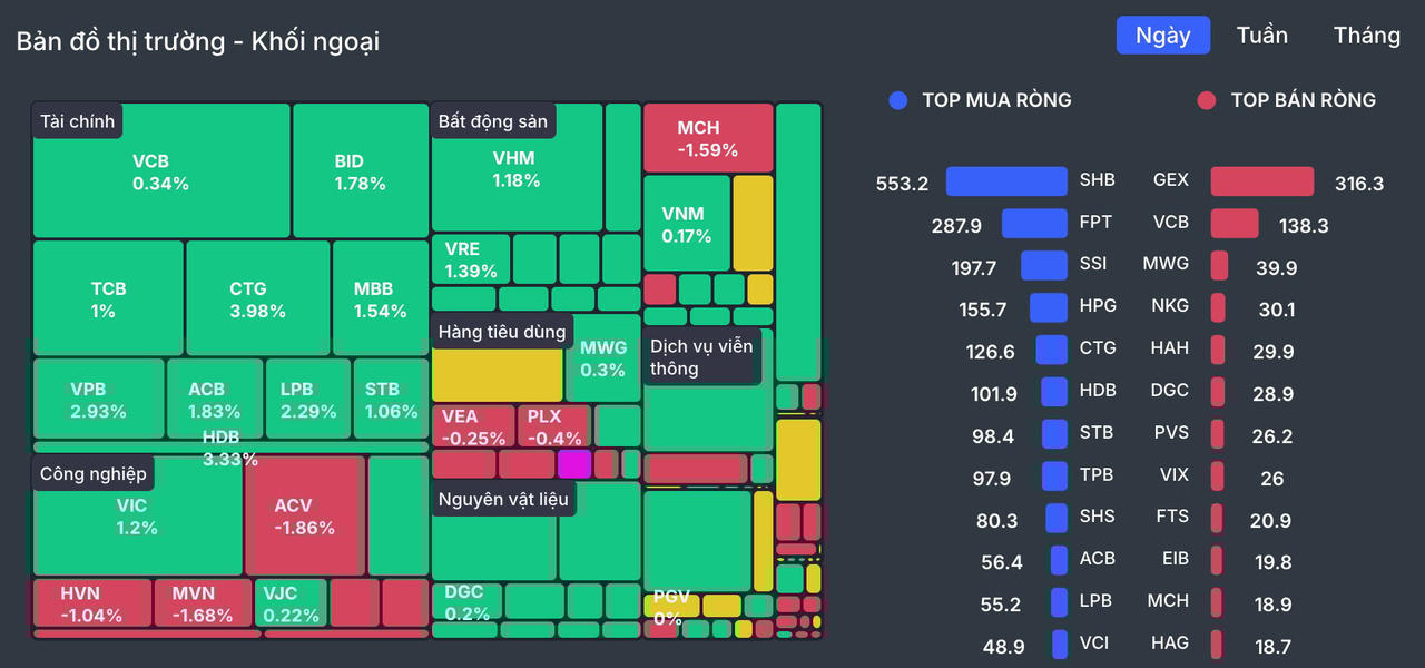 Dòng tiền không chỉ đến từ nhà đầu tư trong nước mà còn có sự nhập cuộc rõ nét của khối ngoại. Trong phiên, khối ngoại mua ròng hơn 1.000 tỷ đồng, tập trung mạnh vào các mã tài chính như SHB (+559 tỷ đồng), SSI (+166 tỷ đồng), CTG (+121 tỷ đồng)...