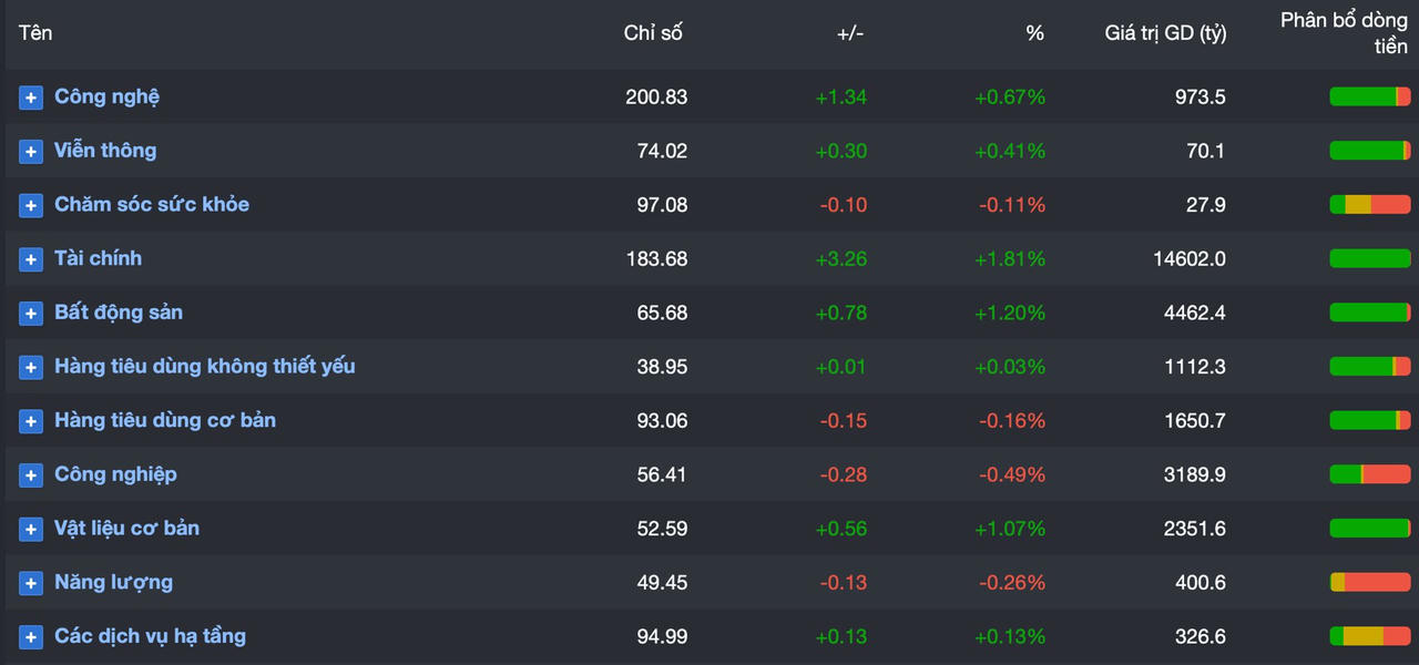 Theo thống kê từ FireAnt, tổng giá trị giao dịch của nhóm cổ phiếu tài chính đạt trên 14.000 tỷ đồng, chiếm gần 50% tổng giá trị giao dịch toàn phiên. Diễn biến này tiếp tục khẳng định vai trò dẫn dắt của nhóm tài chính trong bối cảnh thị trường duy trì đà tăng mạnh cả về điểm số và thanh khoản.