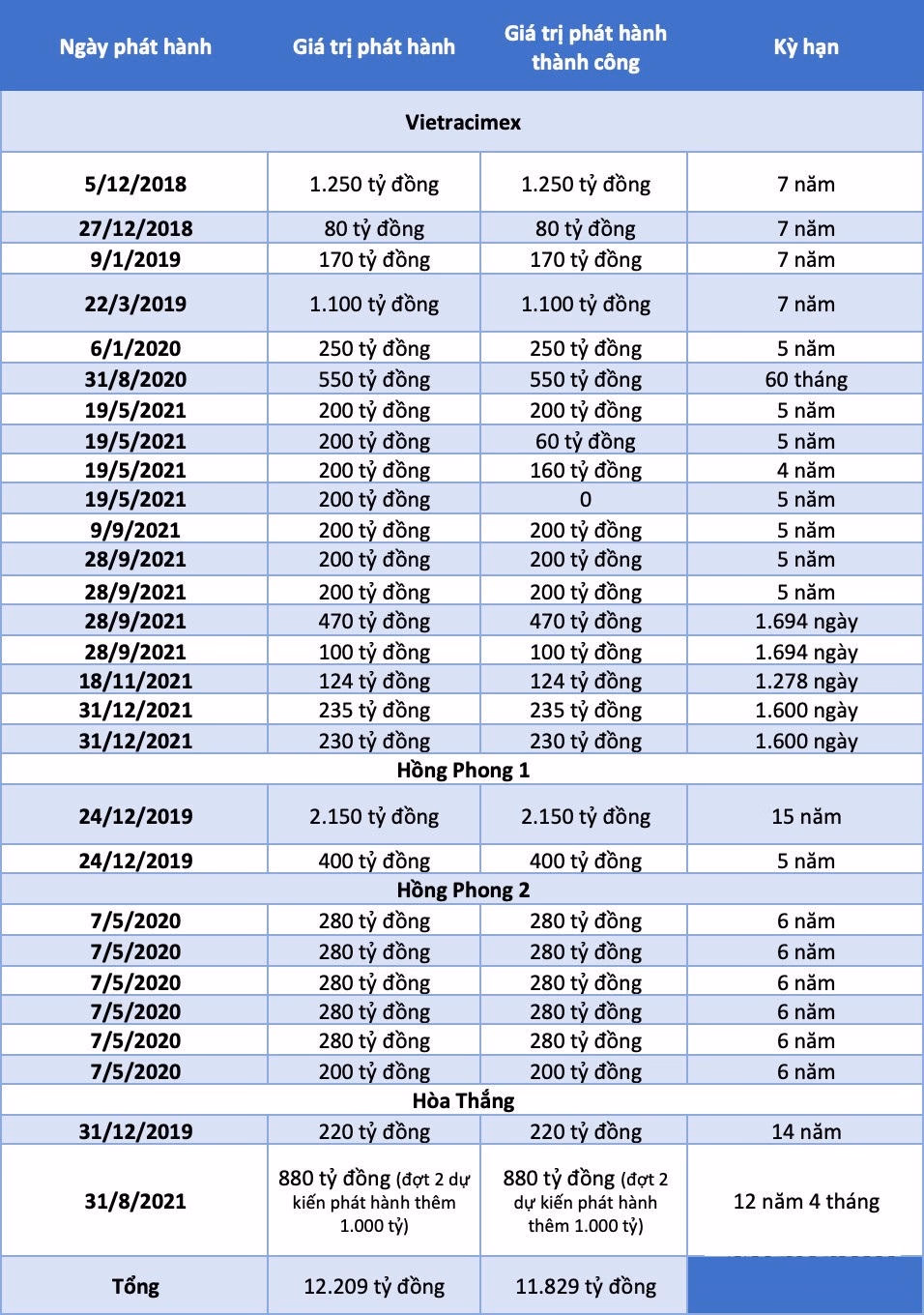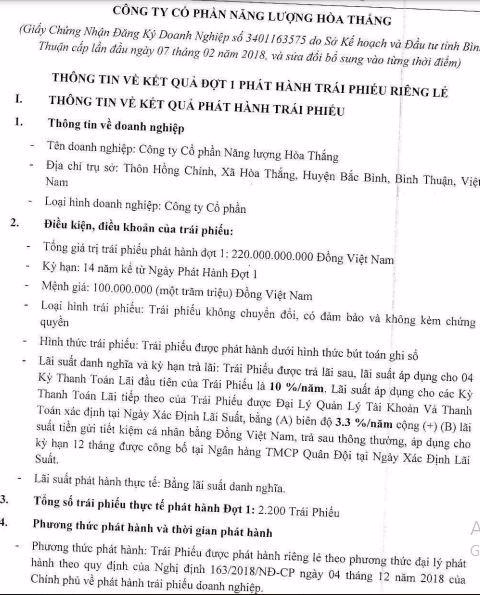 Được biết, Tổng CTCP Thương mại Xây dựng (Vietracimex) phát hành trái phiếu lần đầu tiên vào năm 2018 hút về 880 tỷ đồng trái phiếu, đây là loại hình không chuyển đổi, không kèm chứng quyền và có tài sản bảo đảm. Đợt phát hành này là một tỏng 2 đợt phát hành trái phiếu nhằm huy động tối đa 1.880 tỷ đồng của Hòa Thắng để đầu tư vào dự án Nhà máy điện gió Hòa Thắng 1.2 tại Bình Thuận. Lô trái phiếu có kỳ hạn dài lên tới 12 năm 4 tháng, lãi suất áp dụng cho 4 kỳ tính lãi đầu tiên là 10%/năm.