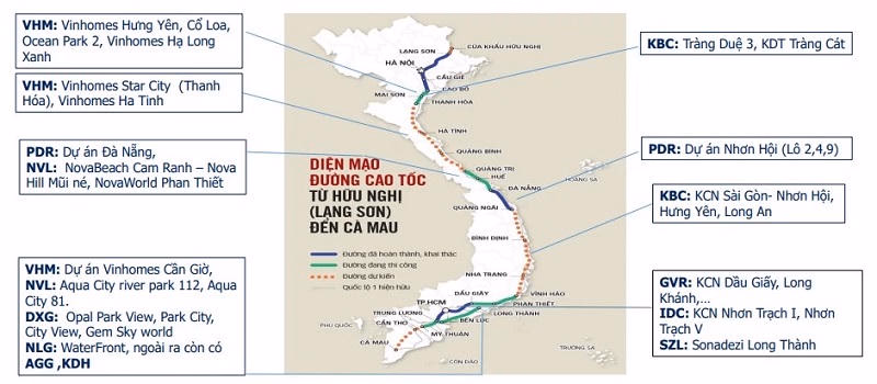 Lấy đơn cử như CTCP Vinhomes (Mã chứng khoán: VHM) với các dự án sẽ được hưởng lợi từ việc tuyến cao tốc Bắc – Nam chạy qua gồm: dự án Vinhomes Dream City (Oceans Park 2) quy mô 460 ha, với tổng mức đầu tư 33.000 tỷ đồng tại Văn Giang, Hưng Yên; dự án Khu đô thị Đại An (dự án được Vinhomes thâu tóm vào năm 2021), với diện tích 294 ha, vốn đầu tư trực tiếp gần 32.700 tỷ đồng (1,4 tỷ USD).