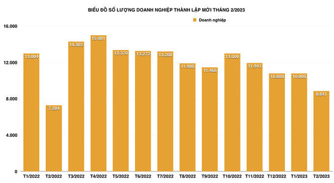 Sáng ngày 28/2, Tổng Cục Thống kê (Bộ Kế hoạch và Đầu tư) đã công bố tình hình kinh tế - xã hội tháng 2 và 2 tháng đầu năm 2023. Theo đó, trong tháng 2/2023, cả nước có 8.841 doanh nghiệp thành lập mới với số vốn đăng ký là 65,6 nghìn tỷ đồng và số lao động đăng ký gần 51,1 nghìn lao động, giảm 18,5% về số doanh nghiệp đăng ký, giảm 33,8% về vốn đăng ký và giảm 25,6% về số lao động so với tháng 1/2023.