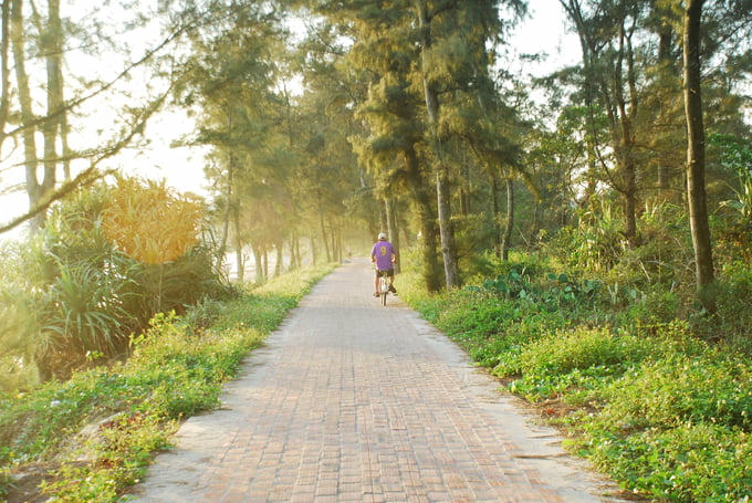 Con đường dài hơn 2km được lát gạch đỏ, men theo bờ biển là điểm check-in lãng mạn trên đảo Cô Tô. Được mệnh danh là con đường tình yêu, lối đi có hai bên là bóng mát của hàng phi lao xanh, vi vu theo gió biển, gần kề là sóng xô bờ cát, nắng vàng len lỏi qua những tán lá... Du khách sẽ có cảm giác như thấy hình ảnh quen thuộc này trên bộ phim truyền hình Hàn Quốc lãng mạn nào đó.