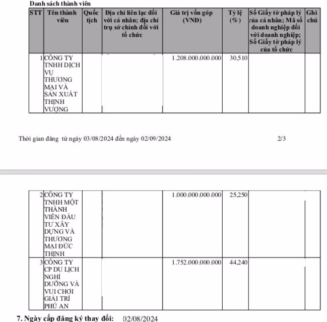 Đến tháng 7/2020, thành viên góp vốn của công ty tiếp tục có sự biến động. Theo đó, thành viên góp vốn gồm có: Công ty TNHH Đầu tư tài chính và thương mại Tấn Phát góp 935 tỷ đồng (tỷ lệ 23,61%); CTCP Thương mại dịch vụ và BĐS Kim Sơn góp 1.525 tỷ đồng (tỷ lệ 38,51%) và Công ty TNHH TNHH MTV Đầu tư và xây dựng thương mại Đức Thịnh góp 1.500 tỷ đồng (tỷ lệ 37,88%).