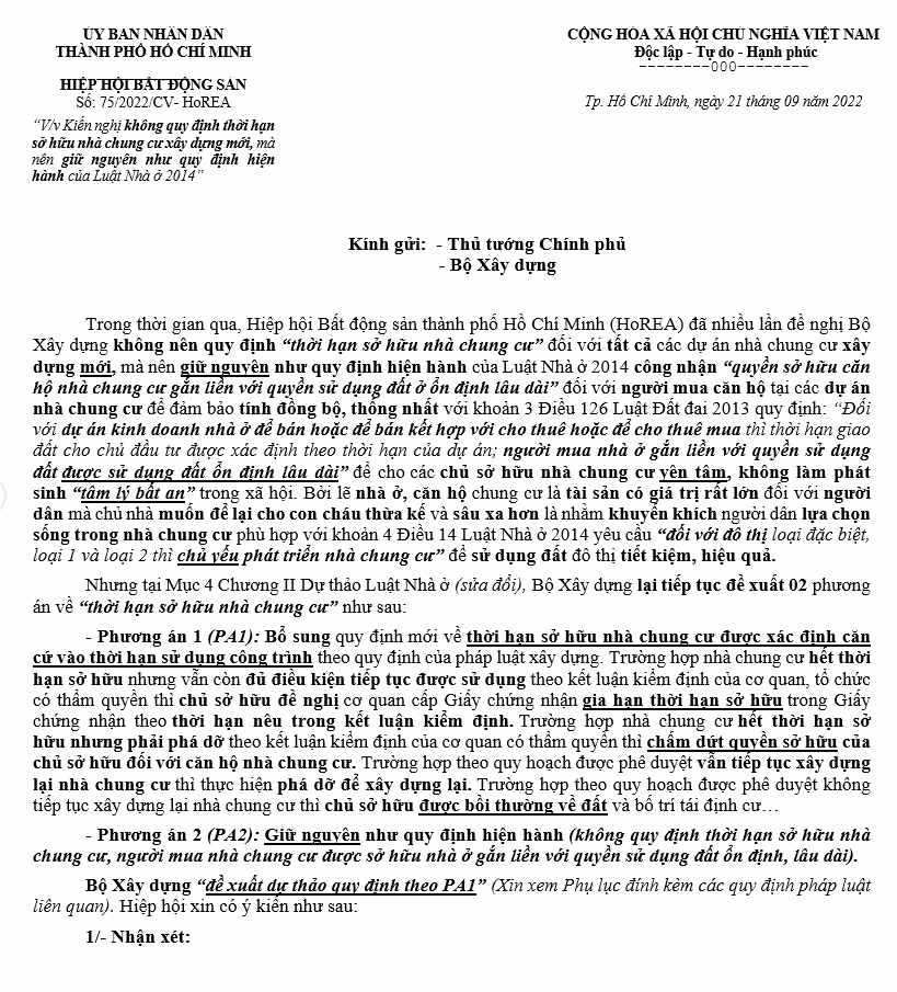 Hiệp hội Bất động sản thành phố Hồ Chí Minh (HoREA) kiến nghị không quy định thời hạn sở hữu nhà chung cư xây dựng mới, mà nên giữ nguyên như quy định hiện hành của Luật Nhà ở 2014.