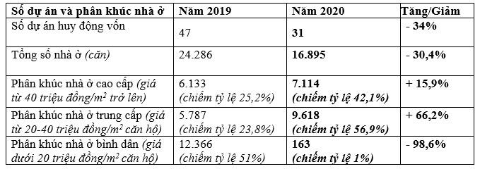 Cụ thể, theo số liệu thống kê đủ 12 tháng trong năm 2020 của HoREA, Sở Xây dựng đã xác nhận đủ điều kiện để huy động vốn sản phẩm nhà ở hình thành trong tương lai của 31 dự án (giảm 16 dự án), giảm 34% so với năm 2019, với tổng số 16.895 căn nhà, giảm 30,4% so với năm 2019 (Gồm có: 15.275 căn hộ (1.023.269 m2 sàn xây dựng); 1.617 căn nhà thấp tầng (515.340 m2 sàn xây dựng) và 03 căn biệt thự (1.589 m2sàn xây dựng)). Tổng giá trị huy động vốn là 66.674 tỷ đồng (đã bao gồm VAT, chưa bao gồm 2% phí bảo trì). Trong đó, có 7.114 căn nhà thuộc phân khúc nhà ở cao cấp, chiếm tỷ lệ 42,1%, tăng 15,9%; Phân khúc nhà ở trung cấp có 9.618 căn chiếm tỷ lệ 56,9%, tăng 66,2%; Phân khúc nhà ở bình dân chỉ có 163 căn, chỉ chiếm tỷ lệ 1%, giảm đến 98,6% so với năm 2019
