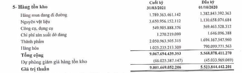 Cụ thể, theo báo cáo tài chính hợp nhất quý 1/2021 (tức là quý 2 trong niên độ 2020-2021 của Hoa Sen) cho thấy tập đoàn của Chủ tịch Lê Phước Vũ đang có hơn 9.067 tỷ đồng hàng tồn kho tại ngày 31/3/2021, tăng gần 3.500 tỷ so với ngày đầu niên độ 1/10/2020, tương đương tăng 63%, chiếm 41% tổng tài sản.